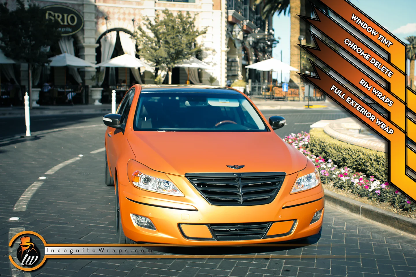 Hyundai Genesis Sedan - Matte Blazing Orange Wrap with Gloss and Matte Black Chrome Delete