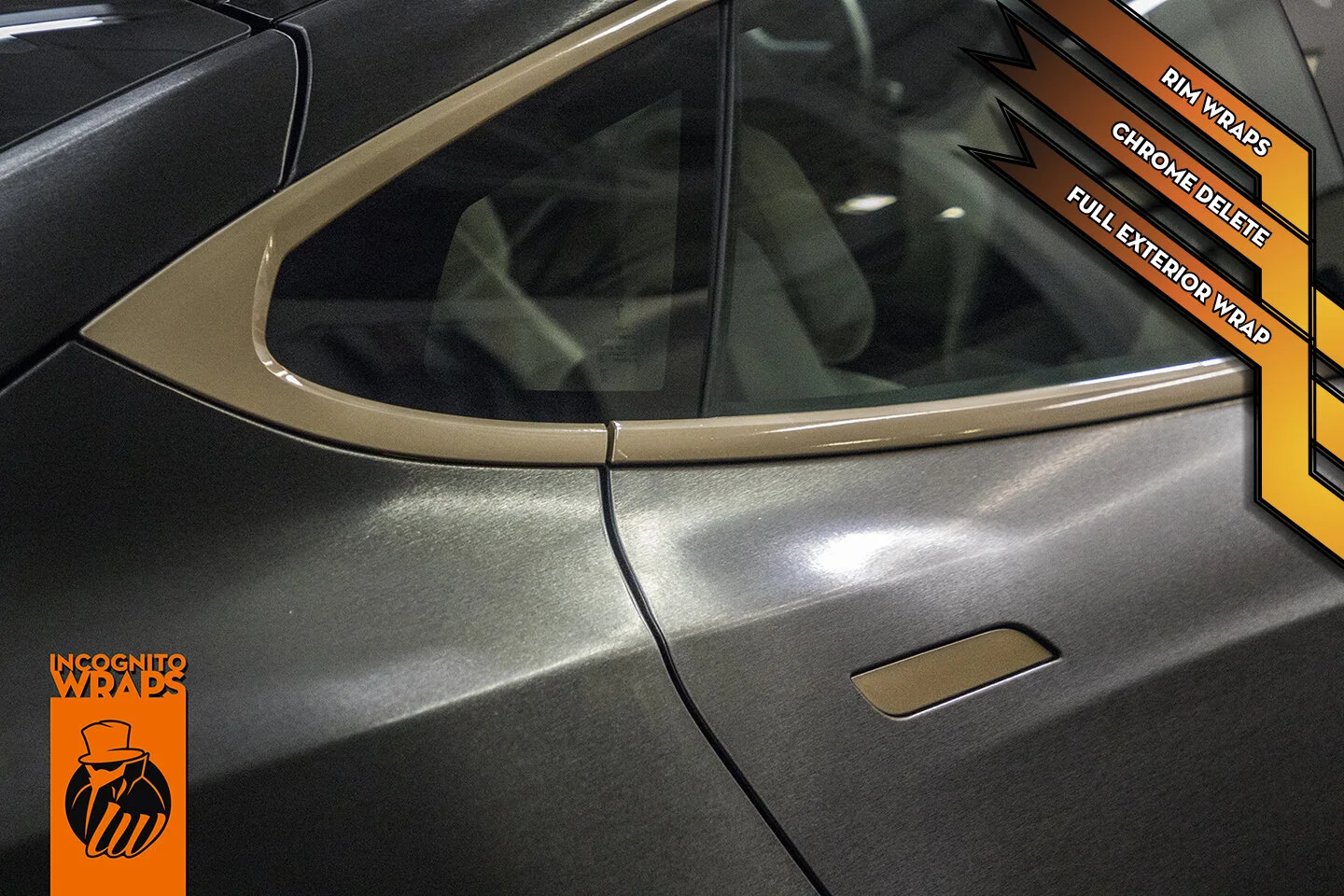 Tesla Model S wrapped in Black Brushed with Brass Chrome Delete